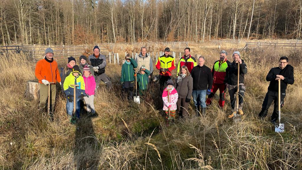 So machten sich am Samstag Morgen 15 Personen, gemeinsam mit unserem Revierförster Daniel Scheer und zwei erfahrenen Forstarbeitern, auf den Weg, um eine Käferfläche aus dem Jahr 2019 mit Eichen und Berg-Ahorn Bäumchen aufzuforsten. Nach einer kurzen Einweisung ging es dann auch gleich los und kleine Teams schwärmten auf der Fläche aus und bestückten die bereits vorbereiteten Gatter mit insgesamt 350 neuen Bäumen.