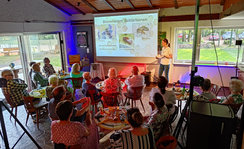 Los ging es mit einem sehr informativen und wirklich spannenden Vortrag von Anna Heidecker, einer Hobby-Imkerin aus Lauterbach. Sie hat in dem Vortrag unter anderem anschaulich dargestellt, was über das Jahr alles so in einem Bienenvolk passiert und welche Aufgaben sich dabei einem Imker stellen. In dem knapp 90 minütigen Vortrag hat sie darüber hinaus aber auch den Bogen gespannt zwischen einem Überblick der unterschiedlichen Bienenarten (weltweit gibt es nämlich über 30.000 Bienenarten), über die Entwicklung und Geschichte der Imkerei, wie wir sie heute kennen, bis hin zu ganz praktischen Dingen, die heute jeder tun kann! Wusstest Du z.B. das es wirklich wichtig ist, Honiggläser zu spülen bevor, man sie ins Altglas wirft? Denn andernfalls können heimische Bienen sich an den Resten mit Krankheiten wie der amerikanischen Faulbrut anstecken, die dann schwerwiegende Folgen für alle Imker in der Region haben kann!