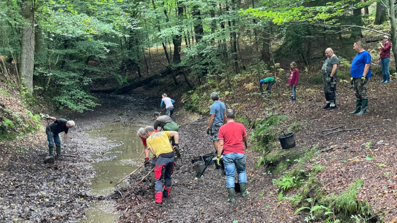 Denn bis jetzt war er mehr mit Totholz und Müll gefüllt statt mit Wasser. Daher wurde der 15. September 2021, der "Tag des offenen Reviers" von unserem Revierförster Daniel Scheer dazu genutzt, zu einer gemeinsamen Aufräumaktion aufzurufen, bei der nicht nur der Revierförster selbst in die Wathose stieg, sondern eine Truppe von über 20 großen und kleinen Lauterbacherinnen und Lauterbachern zusammen kam.